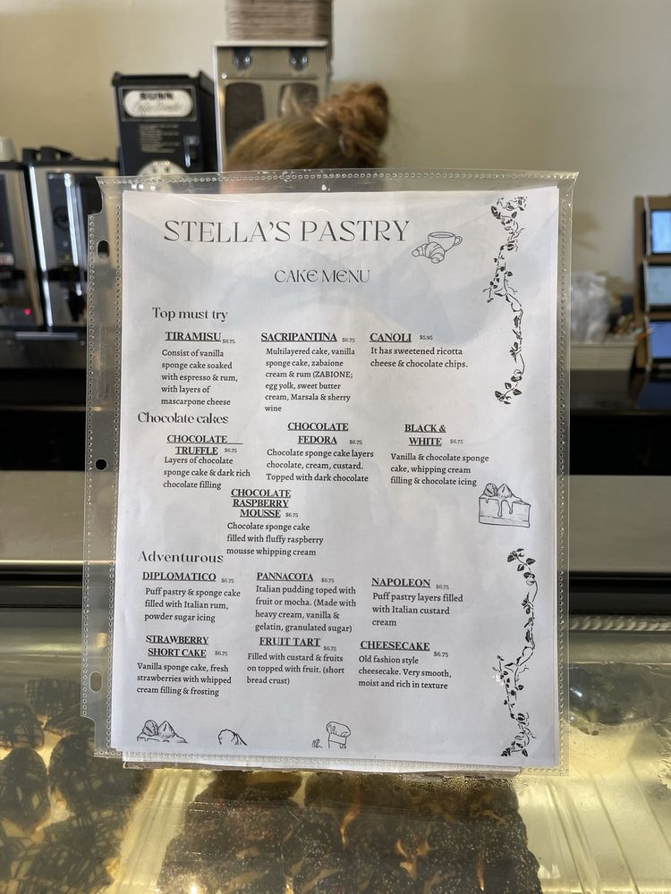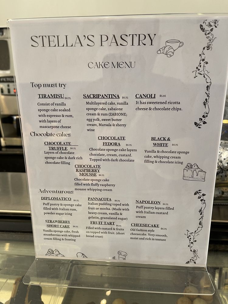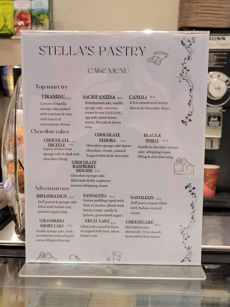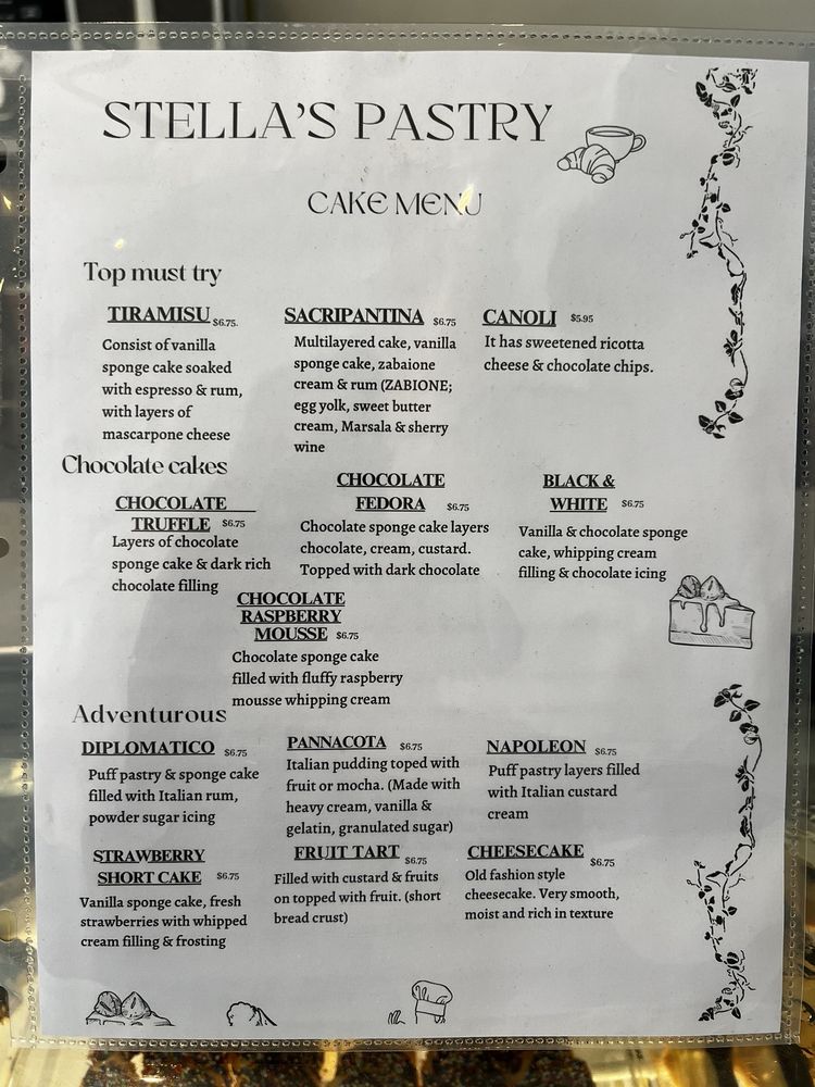 Introducing the menu at Stella Pastry & Cafe, a beloved North Beach institution since 1945, known for its delicious pastries. The menu features delightful treats like Sacripantina sponge cake soaked in rum with zabaione cream, Fedora slice chocolate devil's cake with Italian pastry cream, and cannoli filled with sweetened ricotta and chocolate chips. Customers rave about the heavenly tiramisu and the butter cookies with raspberry and strawberry jam. The desserts are light and fluffy, with a perfect balance of flavors. The cafe offers outdoor seating, making it a great spot to enjoy a sweet treat with friends or family. Don't miss out on the chance to indulge in these delectable pastries at Stella Pastry & Cafe in San Francisco.